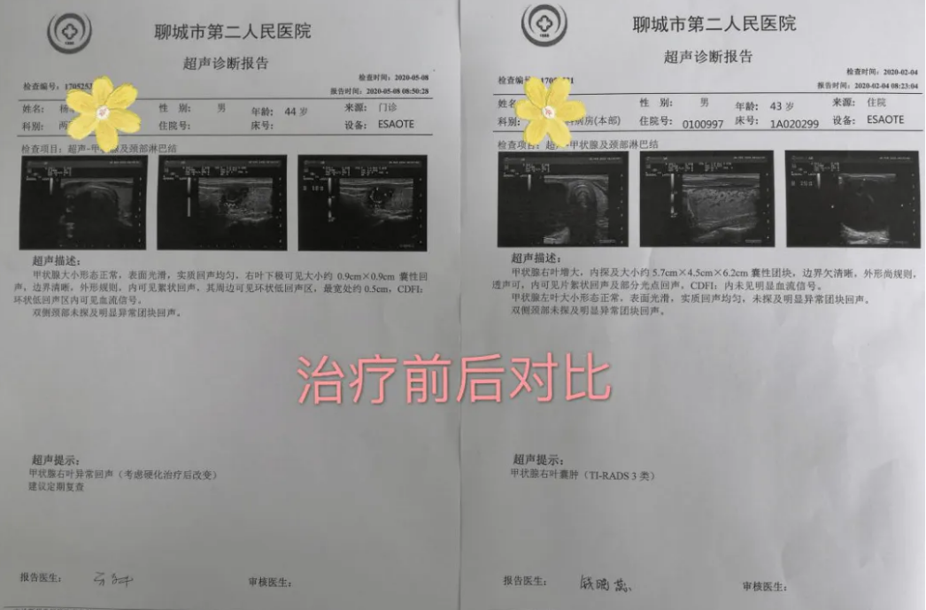 ◈案例四; 聊城,杨先生43岁,检查出5.7cm*4.5cm*6.2cm的囊性甲状腺结节 用药2个疗程后消失!
