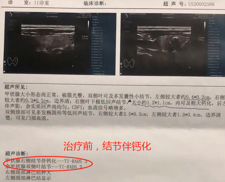 ◈案例五; 本地,贾女士,甲状腺结节3级伴钙化, 用药2个疗程后结节钙化全部消失!