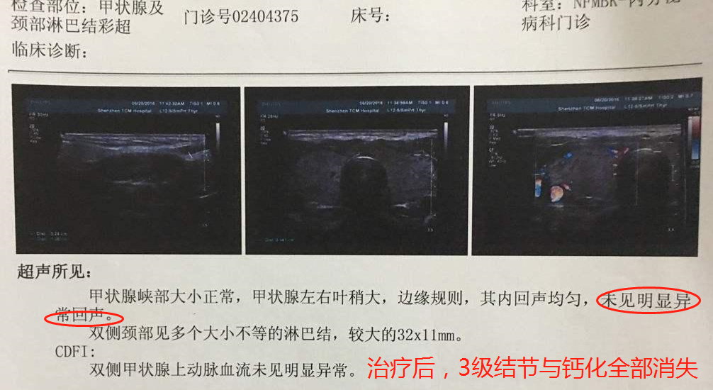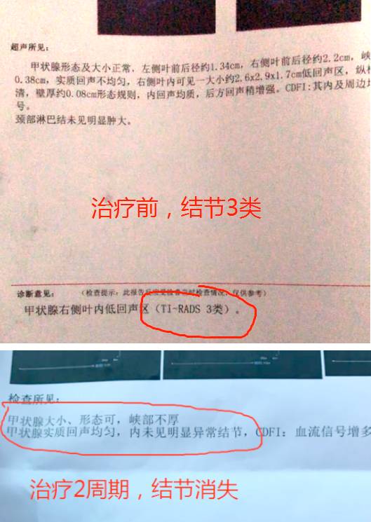 ◈案例二:; 苏州,吴女士,因颈部压迫感去医院检查,查出甲状腺出现2.6*2.9*1.7cm的三级结节,由于担心手术风险以及手术费用问题,在与家人商量后选择中医治疗, 经过2周期治疗,结节消失。