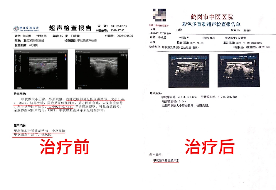 ◈案例一:; 鹤岗 鲁先生 46岁 由于咽喉肿痛去医院检查,查出甲状腺结节0.44*0.35cm,0.6*0.4cm, 经过我处治疗4个周期治疗,结节消散。