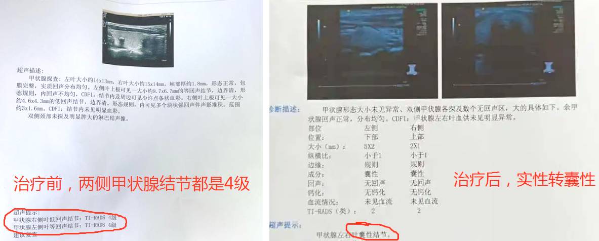 ◈案例三; 福州,李女士,48岁,左右甲状腺均出现4级结节,已经出现恶化指标,之前已经有过结节切除经历此次为术后复发,情况较为严重, 针对李女士情况我针对性采用先稳后治的方针,用药上根据病情变化随时调整,在治疗两个周期后已转为囊性结节恶性指标已消失,病情已稳定。